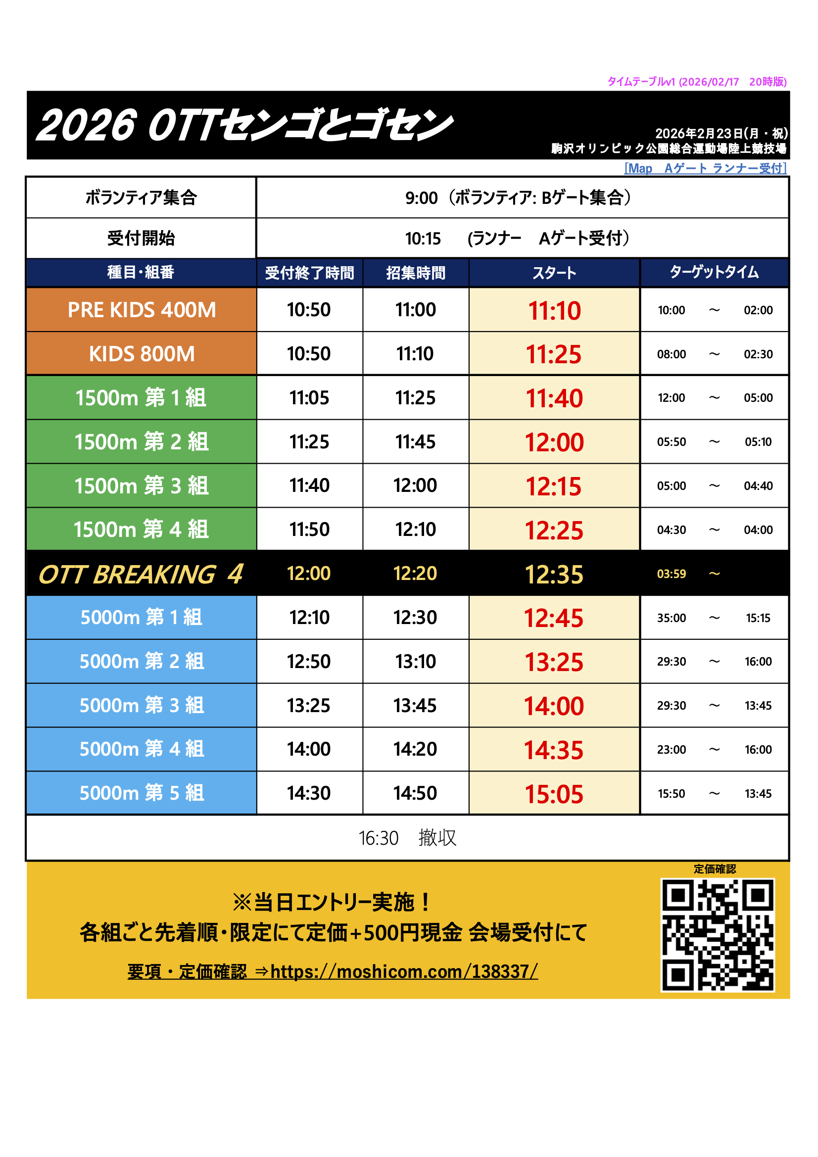 ▶[追加!!]第38回 オトナのタイムトライアル ・2025年2月23日(月・祝) ・駒沢オリンピック公園総合運動場陸上競技場(ランナー受付はAゲート) ▶第38回⇒39回 オトナのタイムトライアル 2026年3月29日(日曜日)世田谷区大蔵競技場 ※雨天決行・荒天中止、※中止の場合は当日朝にSNSにて発表。 |
